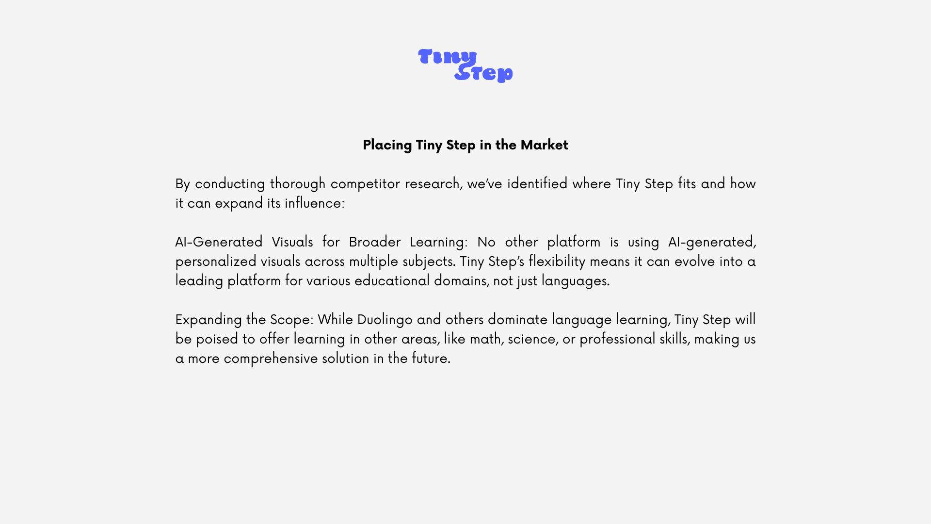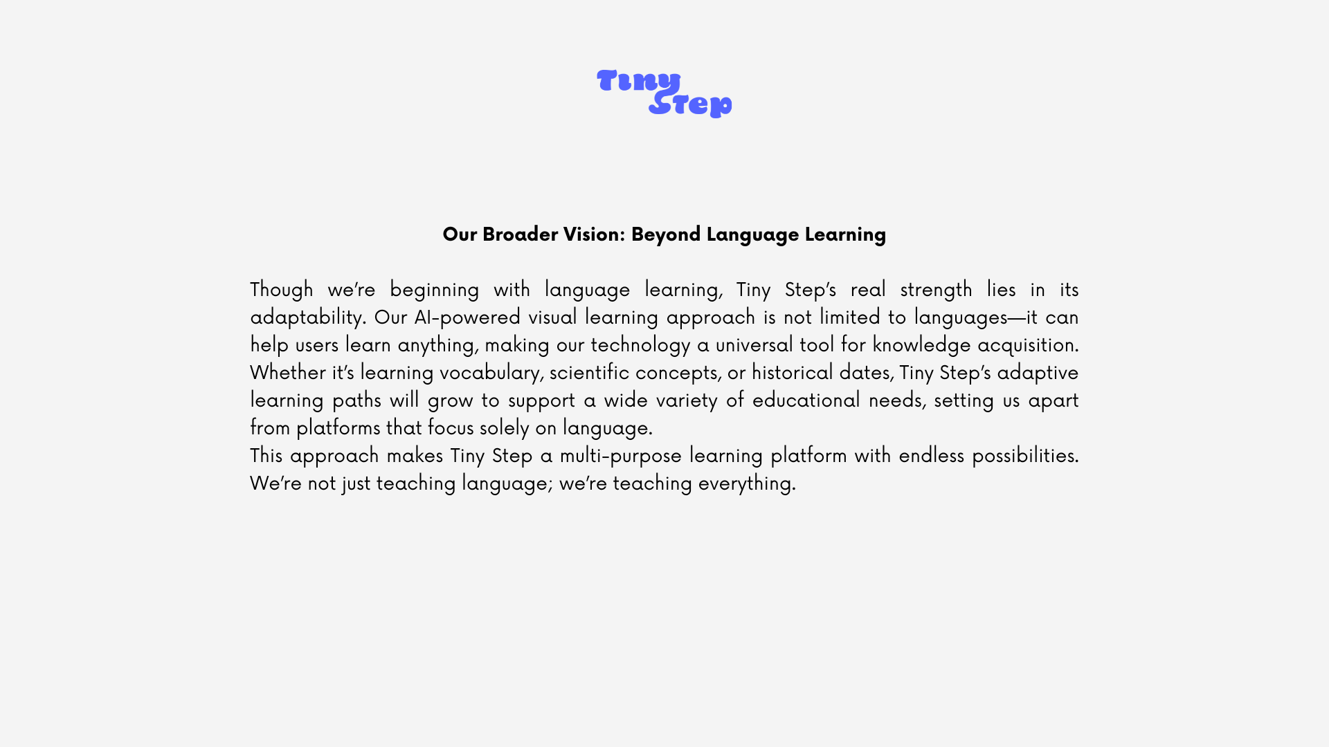 At Tiny Step, we’re committed to providing the most innovative language learning experience, integrating modern AI and visual learning techniques. Our goal is to make language education accessible to all, while standing out with our unique, personalized AI-driven approach that helps learners succeed one visual step at a time.